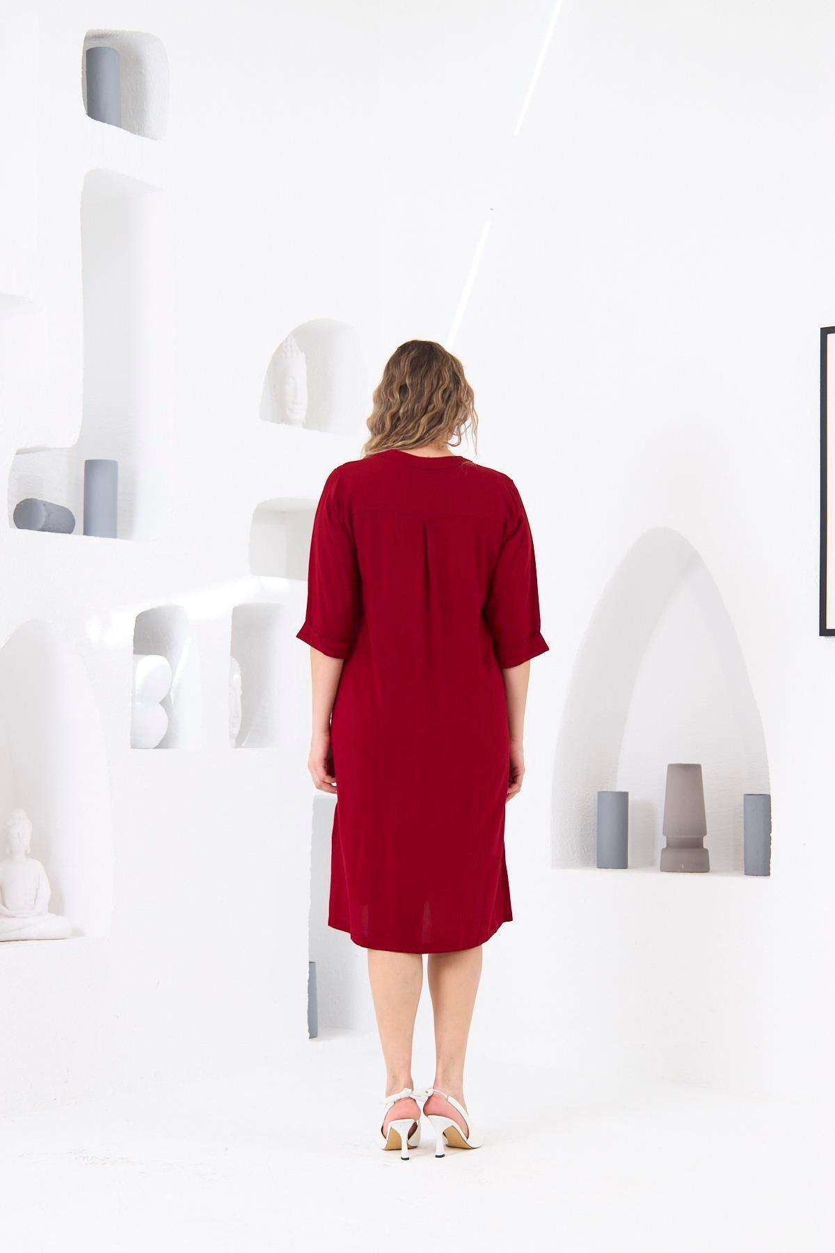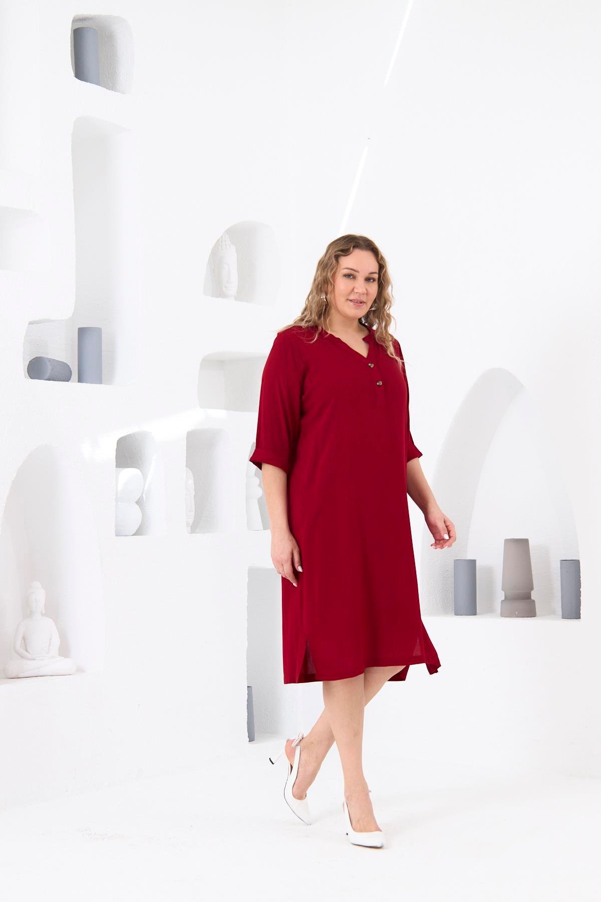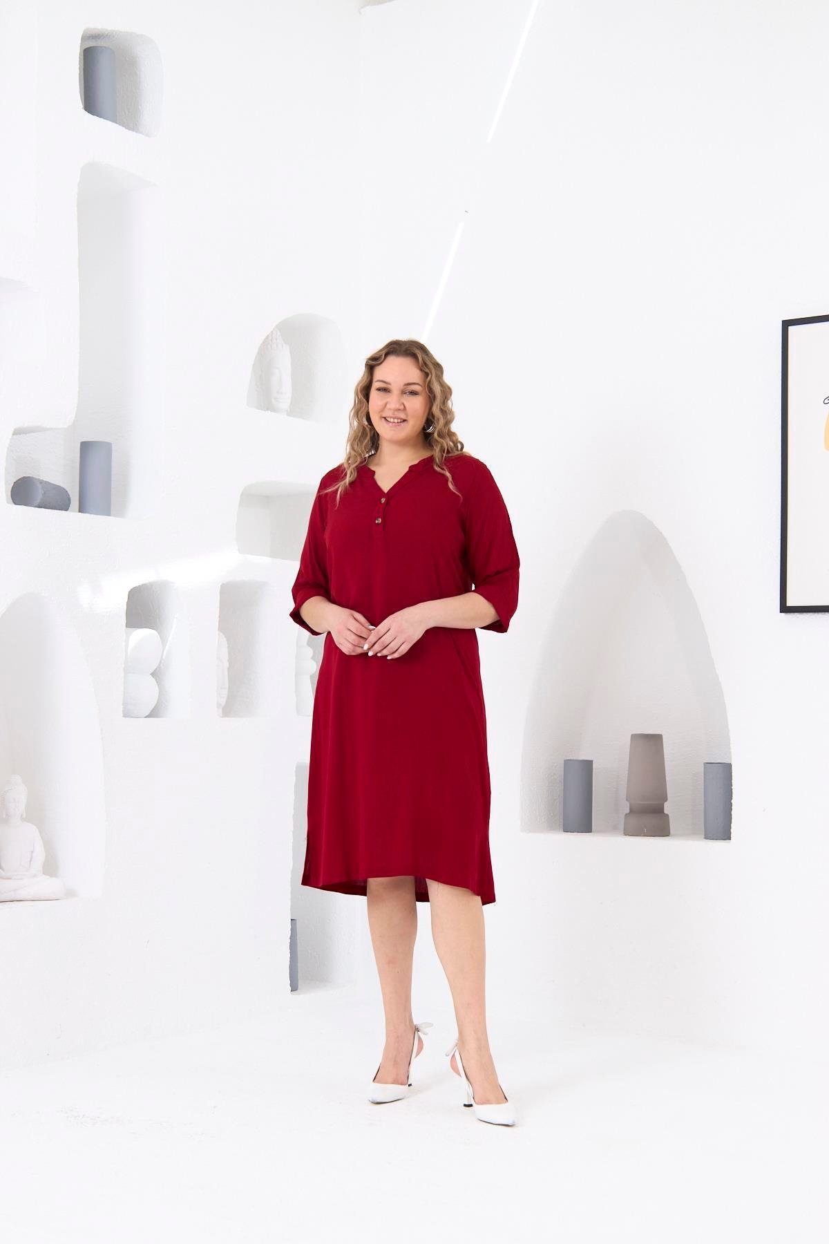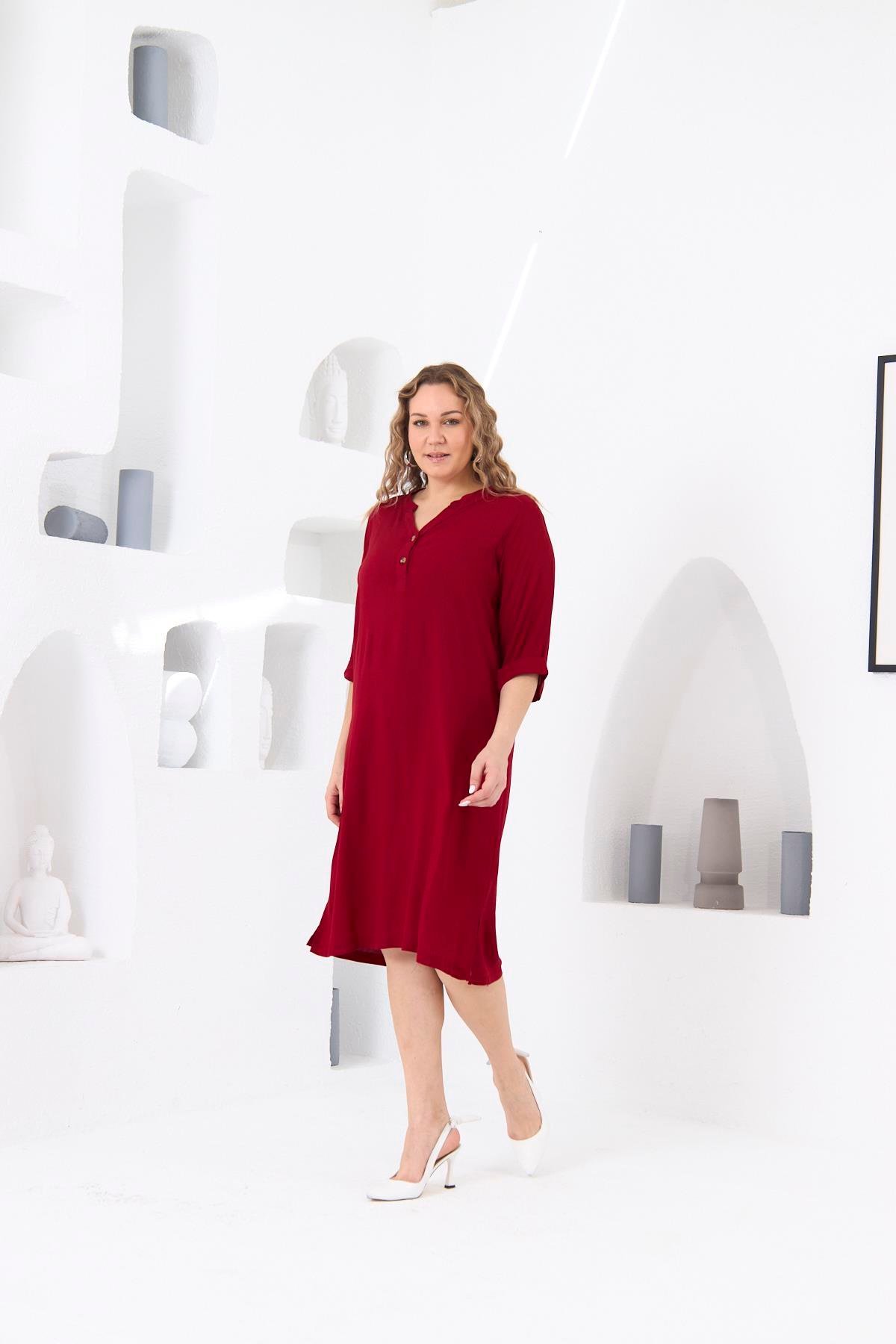 BezeXL Düğme Detaylı Büyük Beden Bordo Viskon Elbise