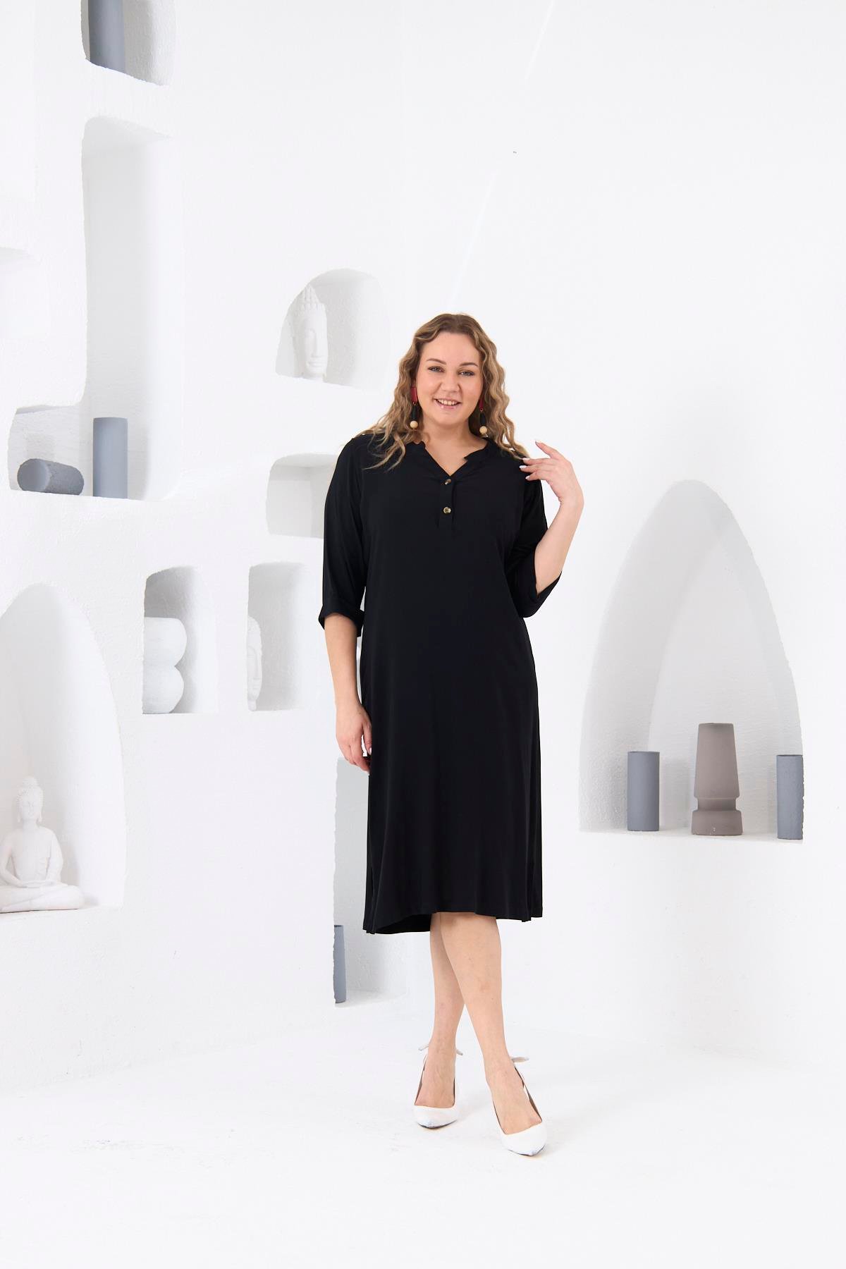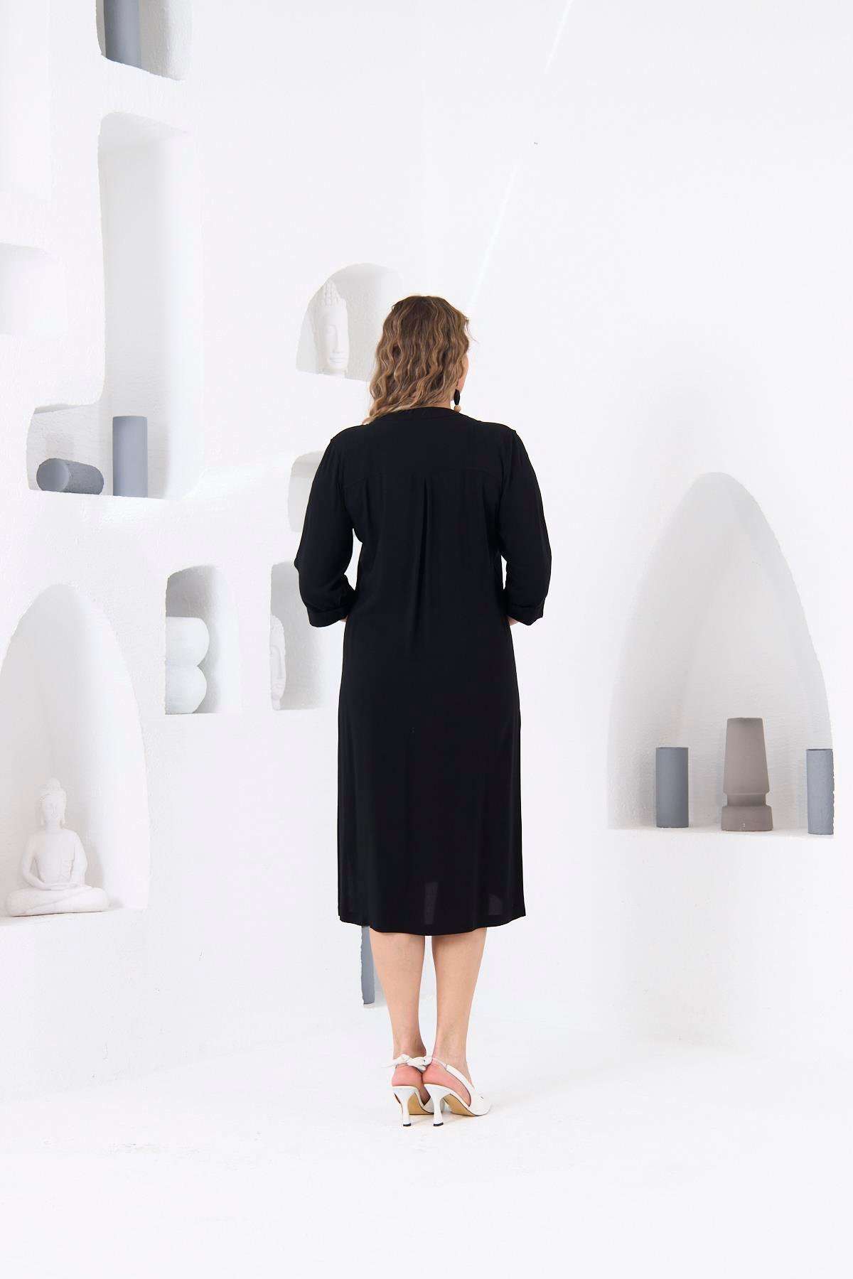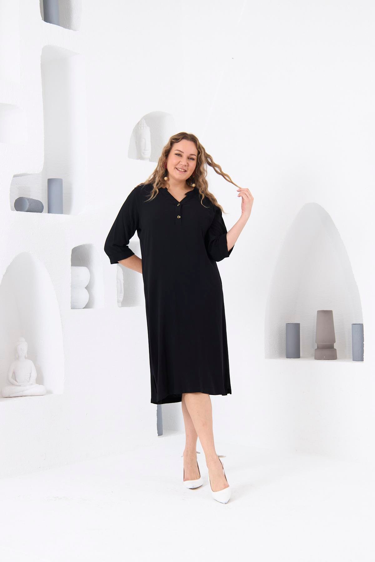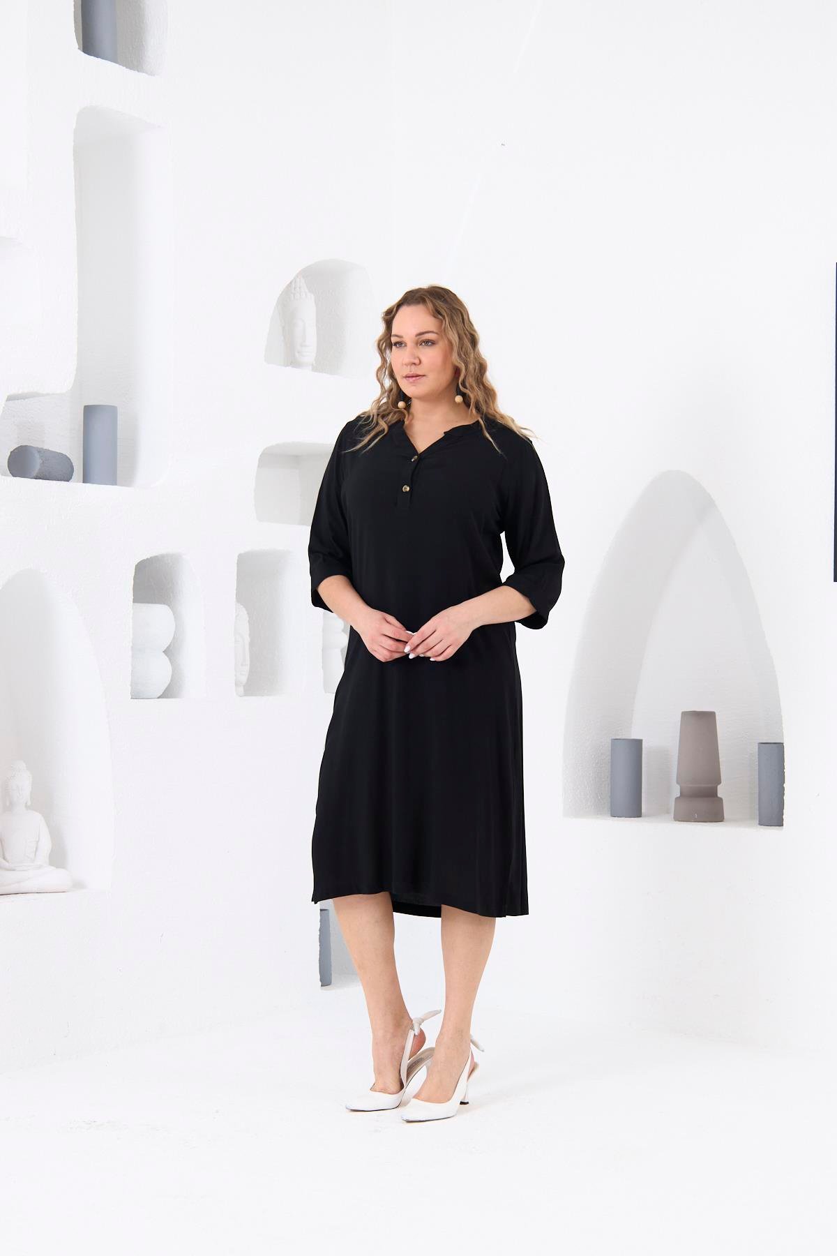 BezeXL Düğme Detaylı Büyük Beden Siyah Viskon Elbise