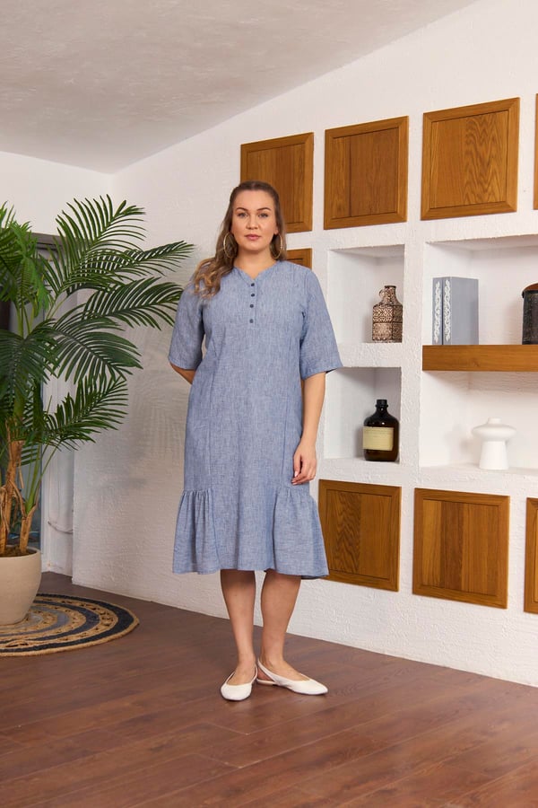 BezeXL Eteği Fırfırlı Hakim Yaka Büyük Beden İndigo Elbise