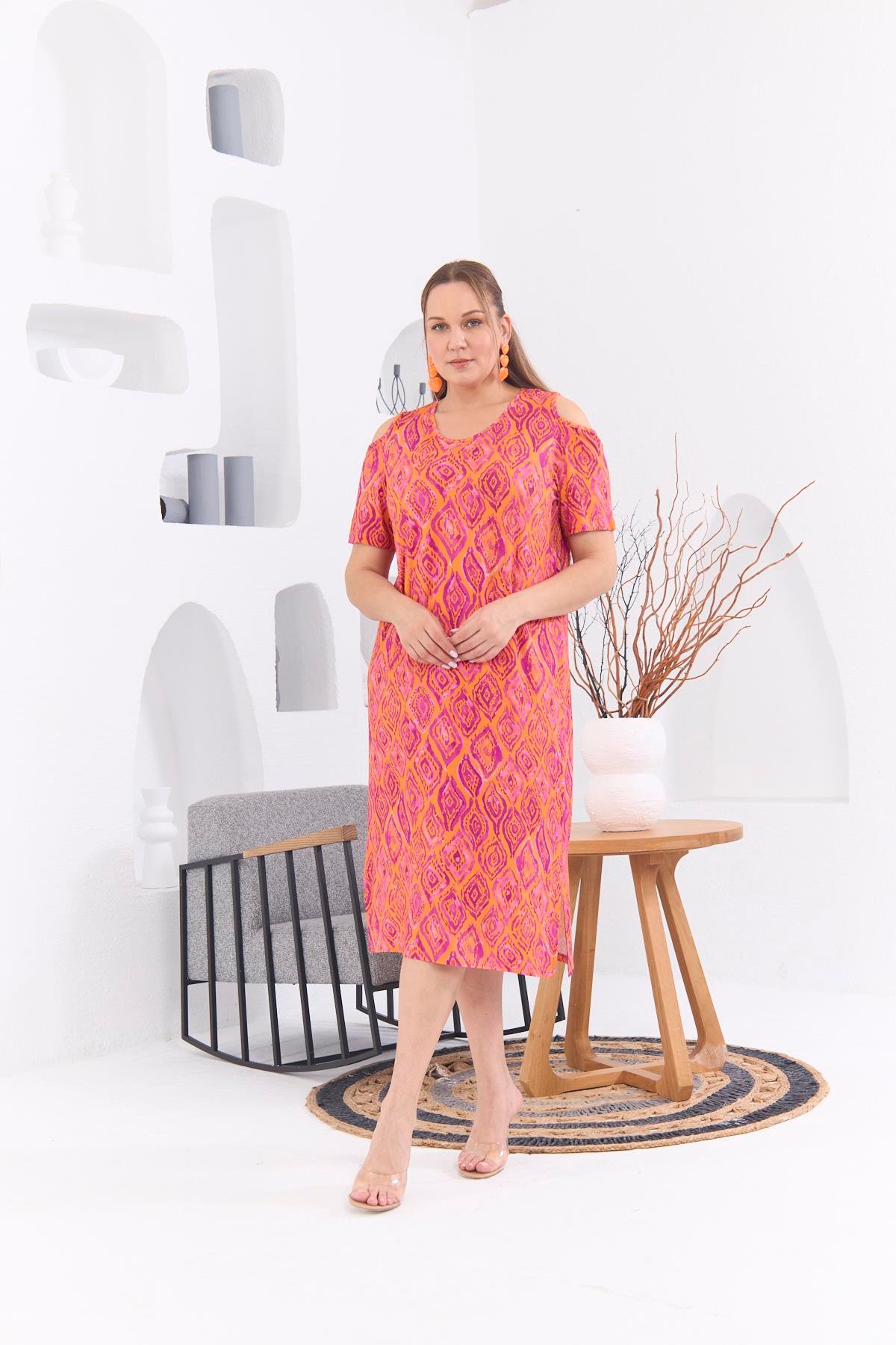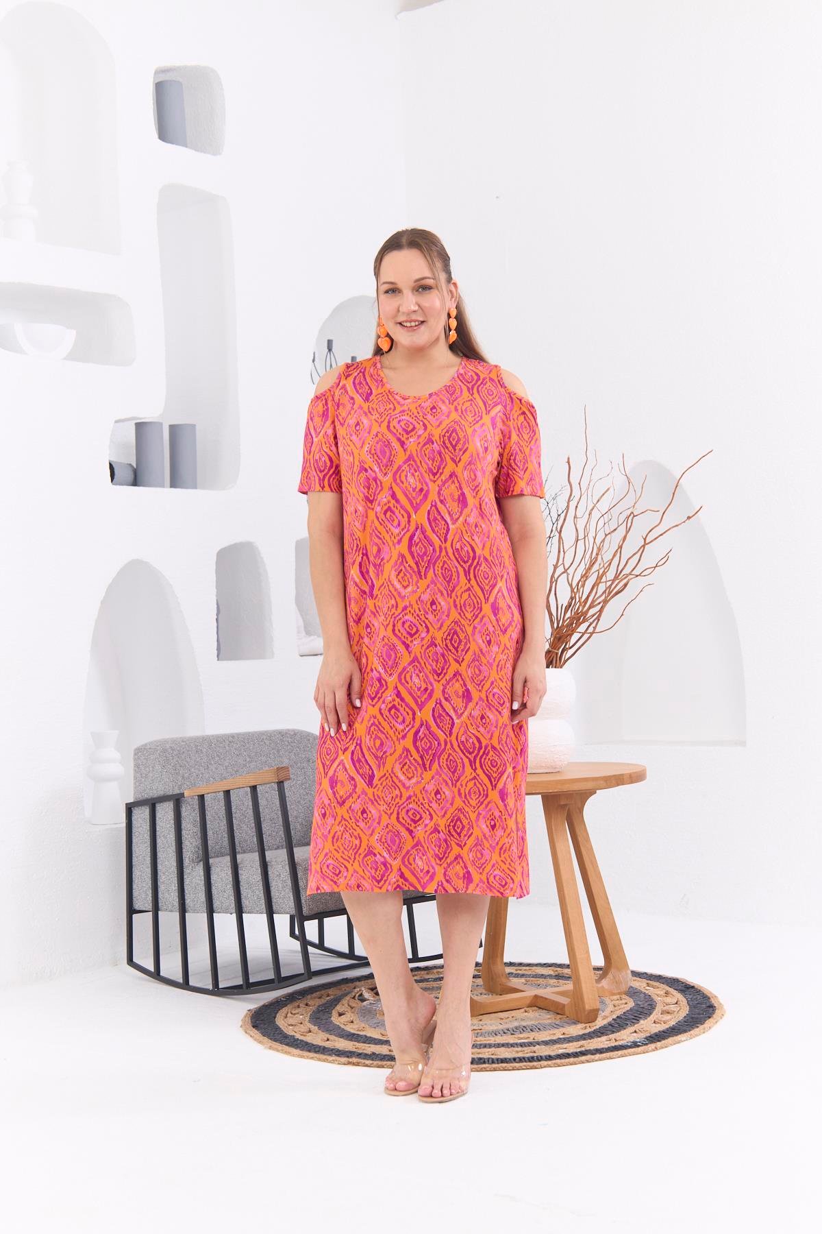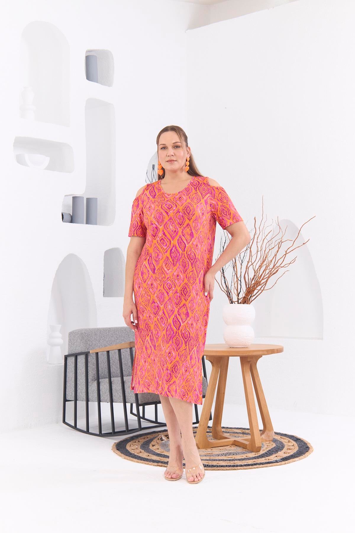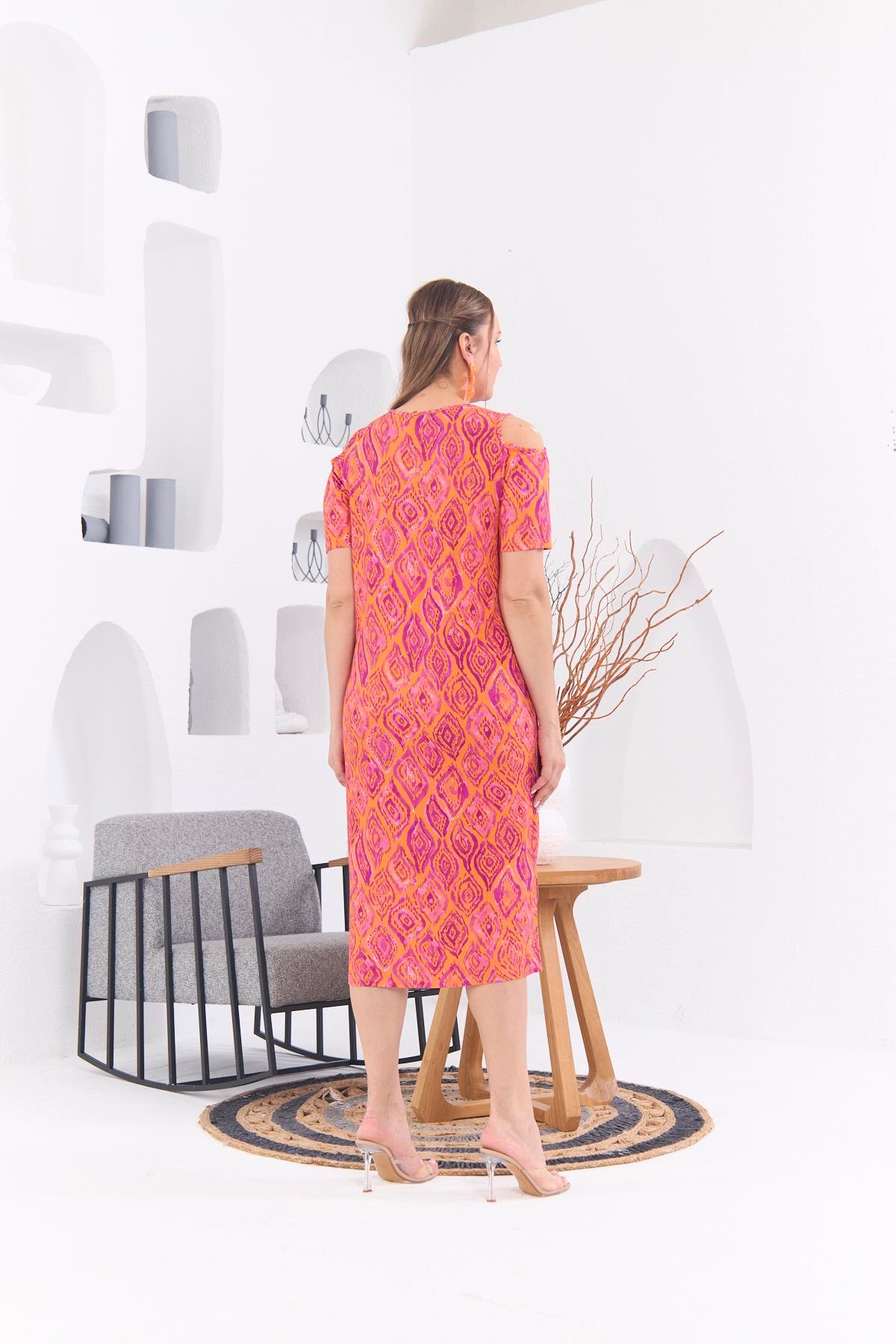 BezeXL Omuz Detaylı Büyük Beden Desenli Oranj Elbise
